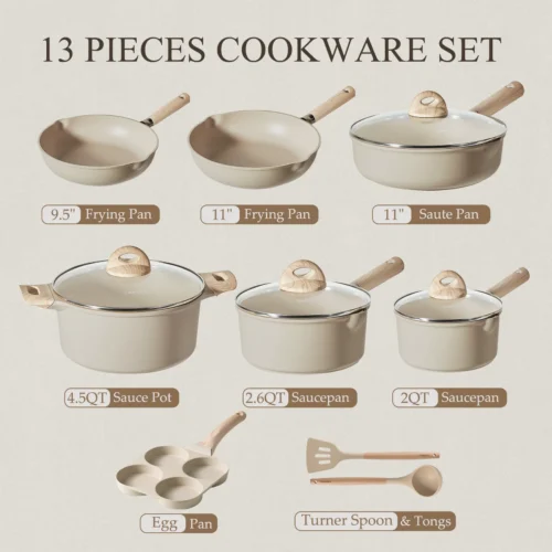 CAROTE 13-Piece Nonstick Pots and Pans Set, Kitchen Cookware Set, Taupe