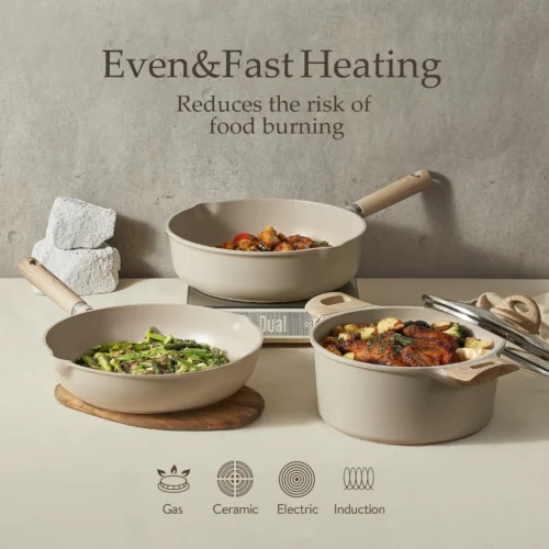 - Lasting performance: The reinforced die-cast aluminum construction of this kitchen pots and pans set makes it resistant to wear and tear, allowing it to withstand frequent usage without compromising its performance.